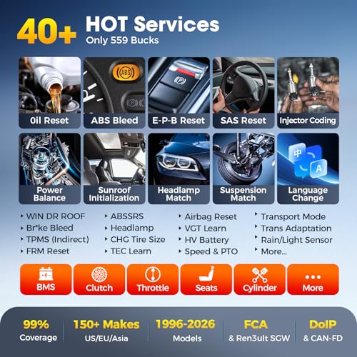 🥇【28→40+ Hot Services for 150+ Makes】MaxiCom MK808S MK808 MK808Z MX808S MK808Z-BT: only 28 services. New MK900BT: 40+ hot services! Covers most-popular resets for “E-P*B, 0il_light, DP.F, S.AS, TPMS, BMS, Injector, Throttle, Gearbox” etc., plus 12+ 2026-new “Transport Mode, HV Battery, Rain/Light Sensor, Reset Control Unit, Sunroof Initialization” and more. Works on 150+ makes, 10,000+ models (~2026). Don’t know if it works on your car? Send us your make-model-year-VIN, get a yes/no in seconds.