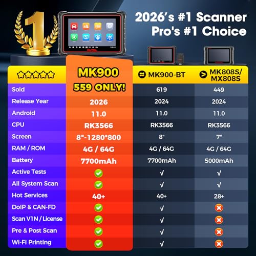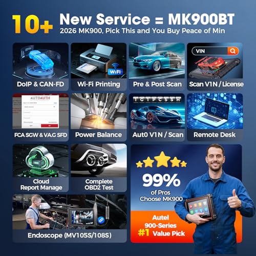 🥇【Level-up Of MK808S MK900 MX900 MK808BT MX808S】2026 flagship Autel MK900 keeps every MK808S MX900 MX808S MK808Z MK808Z-BT MK808K-BT MK900BT features, and adds 2000+ bucks-valued functions: 50→3,000+ active tests, 28→40+ hot services, 2026 new CAN-FD & DoIP, pre/post reports, Wi-Fi print, 10X-faster AutoVIN 2.0, scan VIN/license, and battery testing (need BT506). >> Questions about functions or coverage? Reach out to us anytime: autelcare@outlook,com