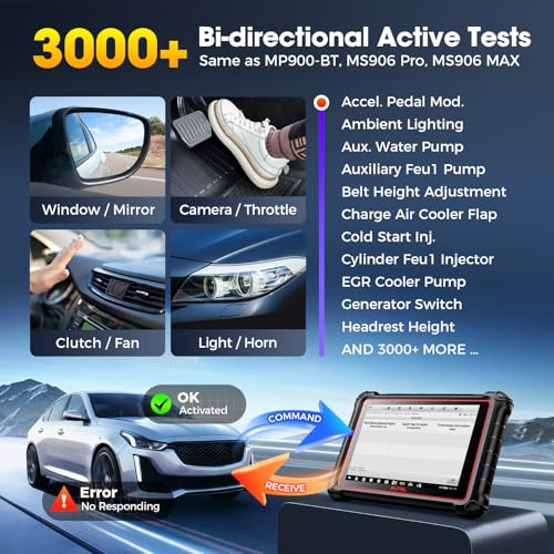 🥇【50→3,000+ Active Tests = MS906 PRO】Unlike MS906BT MS906 MP808 MK808 MX808 MK808BT with only 50 active tests, Autel MK900 gives 3000+ test lists. Fire commands to E-C.Us, watch actuators move, spot bad parts in seconds! Bidirectional menu covers solenoids, actuators, and components of fans, lights, horn, doors, windows, br3kes, throttle, A/C, clutches, mirrors, cameras, pumps, valves & more, lifting diagnostics to pro level. >> Functions vary by V1N: send it to us for fast compatibility check.