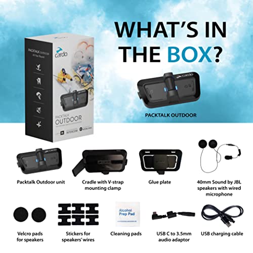 Over-the-air Update: Keeping your unit up-to-date is as easy as it gets. Use your Cardo Connect App to download and install the latest software directly to your Packtalk Outdoor. No cables needed. Automatic Volume: Automatically adjusts your sound volume based on the outside ambient noise. Music Streaming: All the music you ever wanted streamed directly from your smartphone. Control and experience your favorite tune while performing your favorite sport. Phone Integration: Make and answer calls while your phone stays secured in your pocket. Full-day Operation: Up to 10 hours talk time in temperatures as low as -20C means your Packtalk Outdoor will keep you connected all-day long. Fast Charging: Running out of battery? Get 2 hours talk time battery after 20 minutes of charging. USB Type C: Robust and universal USB type C for easy connections to any device. 2 Year Warranty: 2-year warranty for your peace of mind.