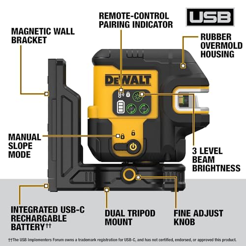 Master challenging layouts with the USB Rechargeable Green 5 Spot and Cross Line Laser Kit. Built to tackle a variety of needs, this laser projects plumb up, plumb down, 3 spots, and cross lines. Help maximize jobsite productivity with up to 16 hours of runtime per charge* and a fast 30-minute charge time . Make precise measurements with an accuracy of ±1/8 in. at 30 ft. and a visible range of up to 150 ft. (45m), extendable up to 330 ft. (100m) maximum range using the DW0892G Detector (sold separately). Achieve accurate positioning using the fine adjustment knob and take advantage of a compact design that can be conveniently stored or transported. Stay productive at a distance with the included DCLEAUSBRC2 Remote Control. Class: 2 Wattage: 2.0mW Line / 1.0mW Spot