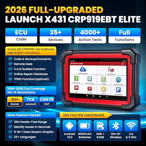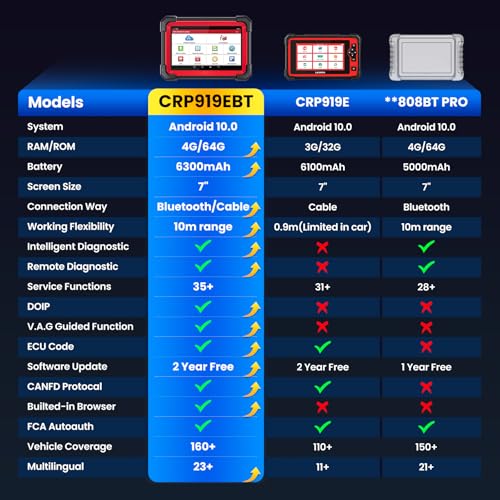 【WHY CRP919EBT STANDS OUT】 All-around upgraded of CRP919E, functions as X431 PRO3S+ V5.0 at a lower cost. Superior OE Functions: ✅Wireless Blutooth diagnostic ✅ ECU Code,✅ 35+ resets✅4000+ Active Tests✅ Full system diagnostics✅New protocols CAN FD & DoIP✅ FCA AutoAuth✅200+ Global brands(1996-2025)✅Level up Hardware: Android 10.0 OS ; Features a 6300mAh high-capacity battery ; 2.4GHz & 5GHz dual-band Wi-Fi ; 4+64GB storage; 7” touch screen; 8MP Camera✅ 2 years of updates. All-in-one advanced OBD2 scanner.