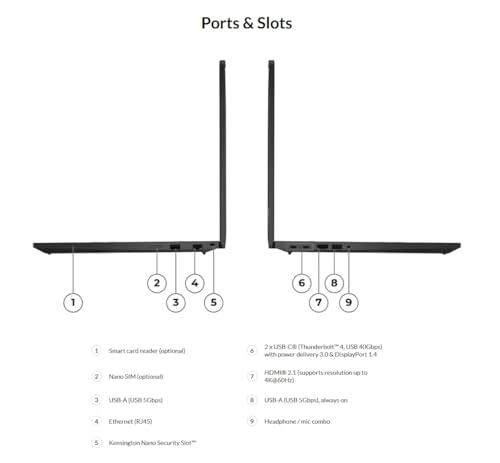 Plenty of connectivity: 1x USB-A (USB 5Gbps / USB 3.2 Gen 1); 1x USB-A (USB 5Gbps / USB 3.2 Gen 1), Always On; 2x USB-C (Thunderbolt 4 / USB4 40Gbps), with PD 3.0 and DisplayPort 1.4; 1x HDMI 2.1, up to 4K/60Hz; 1x Headphone / microphone combo jack (3.5mm); 1x Ethernet (RJ-45); and 1x Security keyhole.