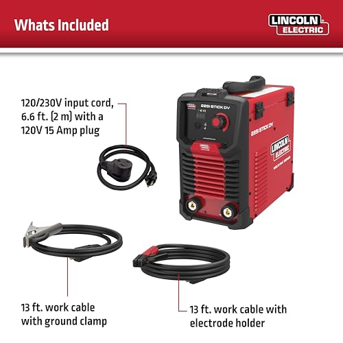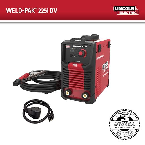 Lincoln Electric Weld-Pak 225i Stick DV has a 10 to 225 amp DC output that supports mild steel stick electrode diameters from 5/64″ to 5/32″. Weighing in at 20 lbs., it is lightweight and portable. The case has a tool box top for storing cables or tools. The smooth arc provides strong welds on 12 gauge sheet metal to 5/16″ thick steel. It has a 30% duty cycle at 225 amps when connected to 230VAC. Touch Start TIG welding is supported. A simple display allows you to dial in the weld settings so you can get started quickly and easily on any job, anywhere – maintenance work, fabrication, light structural and everything in between. The Weld-Pak 225i Stick DV is a lightweight inverter welder capable of DC Stick and DC TIG applications, 120VAC/230VAC input, 120/230/1/60 and 10-225 amp DC welding output range. 30% duty cycle at 225 amps and Weigths 20 lbs. Dimensions of unit 12H x 8W x 14L inches. Welds 12 gauge to 5/16″ single pass. Comes with a shoulder strap, 13 foot work cable and clamp, 13 foot electrode cable and electrode holder, and 6 foot input cable with attached three-prong 230VAC 6-50P plug with 5-15P 120VAC adapter. TIG capability with additional attachments.