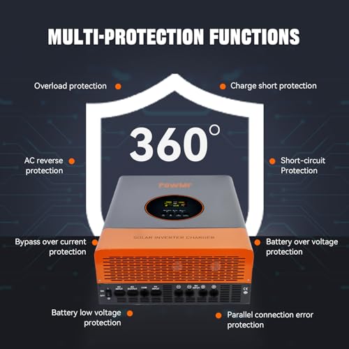 【Multiple Protection】Dual Cooling fan design,efficiently dissipate heat;Durable finish with high anti-corrosion,dust-proof design prevent dust from coming inside the inverter, prolong lifespan of the inverter; Designed with a LCD screen and 3 LED indicators for dynamic display of system data and operating status, and complete protections, including short circuit protection, over voltage and under voltage protection, overload protection, reverse protection, etc