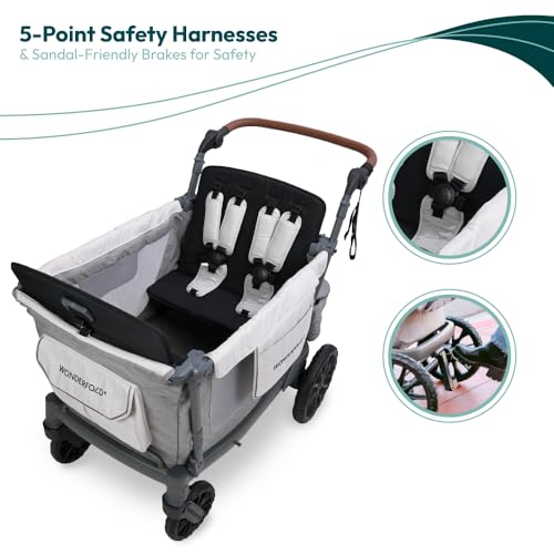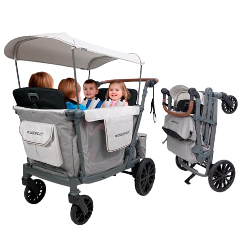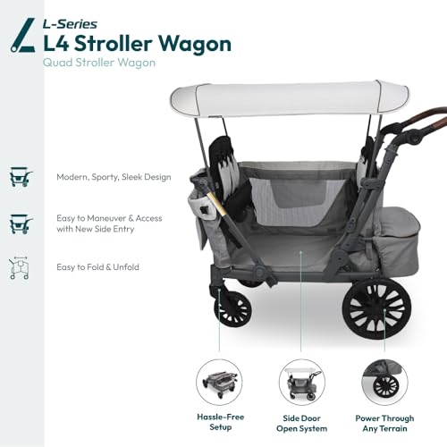 WonderFold L4 Quad Stroller Wagon (4 Seater) – Smooth Ride, Secure Harnesses, and All-Weather Canopy 4 Seat Wagon Stroller for Kids, Safety-Certified – Gray