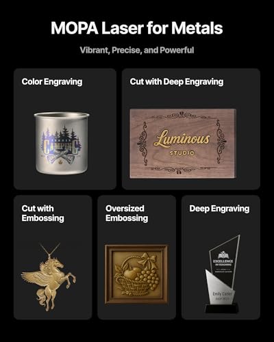All-Metal Capability: The 60W MOPA fiber laser engraver handles diverse metal tasks—3D embossing, deep engraving, color engraving, and cutting 2mm metal—even combined processes. It also supports black marking on aluminum, laser cleaning, and thin metal welding, delivering exceptional results on gold, silver, stainless steel, brass, titanium, and more.