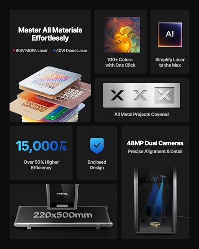 Ultimate Dual-Laser Powerhouse: Equipped with a 60W MOPA fiber laser and a 40W diode laser, the xTool F2 Ultra masters all materials effortlessly—including all metals, wood, acrylic, leather, glass, rubber, fabric, and more. It delivers vibrant color engraving, precise 3D deep engraving, and cuts up to 2 mm metal, 20 mm acrylic, and 23 mm wood—one machine that does it all.